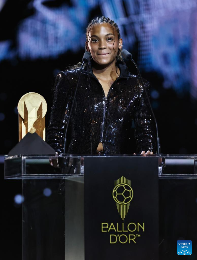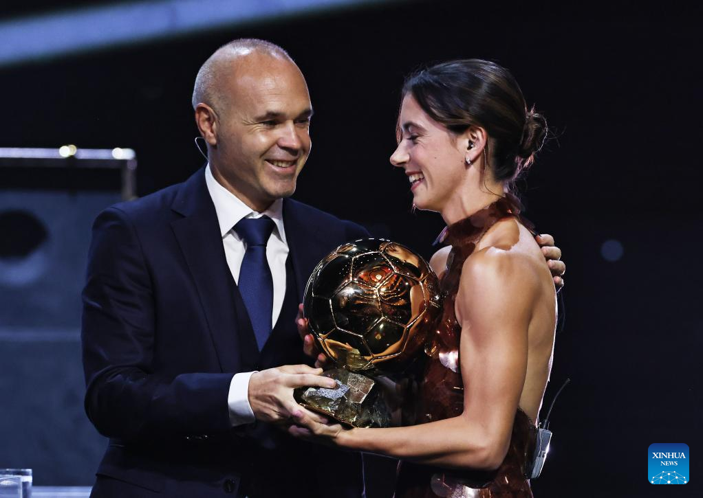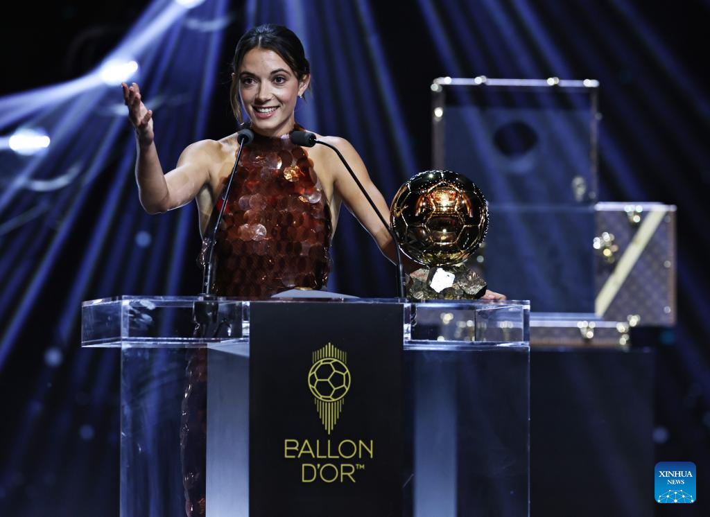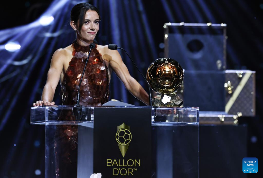 Barcelona's Spanish midfielder Aitana Bonmati receives the Woman Ballon d'Or award during the 2025 Ballon d'Or France Football award ceremony at the Theatre du Chatelet in Paris, France, on Sept. 22, 2025. (Xinhua/Gao Jing)