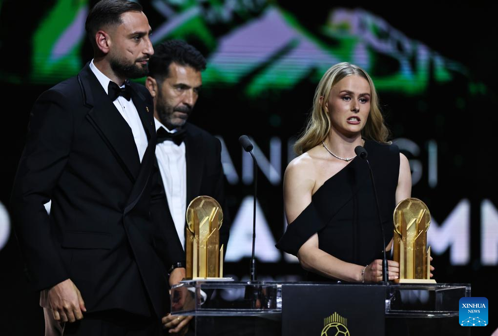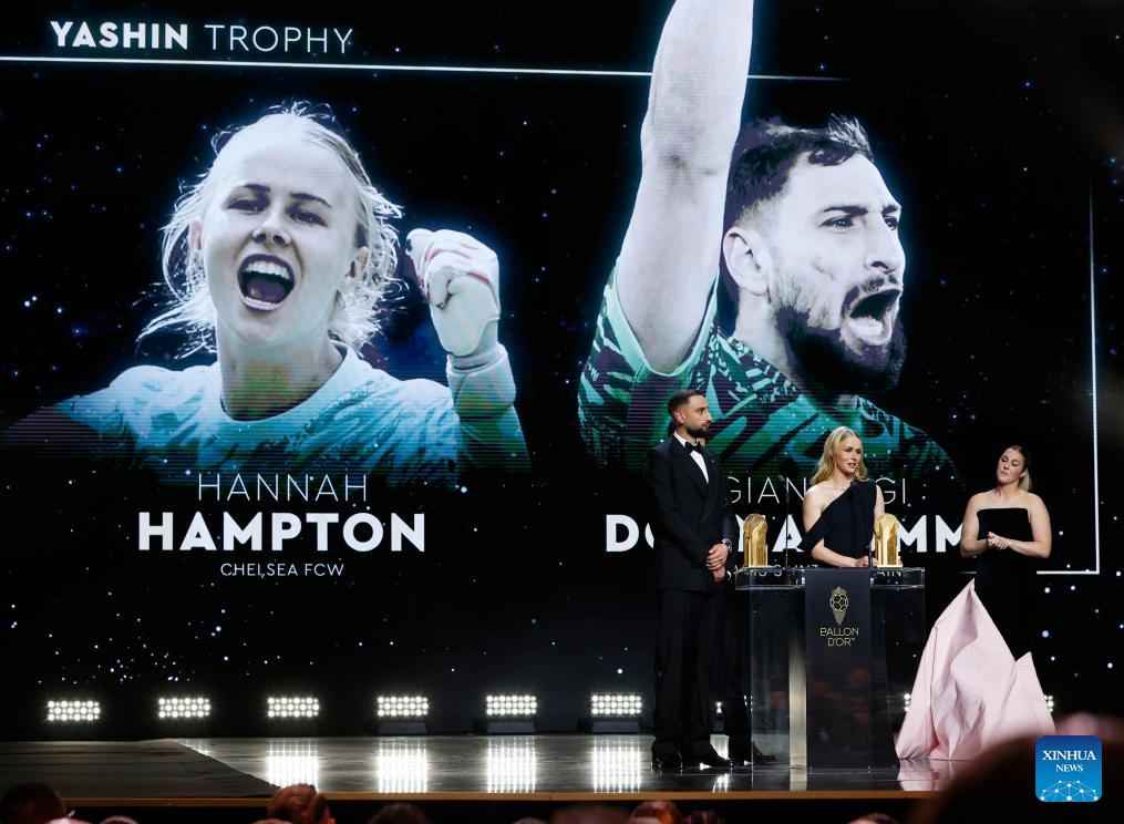 England's goalkeeper Hannah Hampton (C) speaks next to Italy's goalkeeper Gianluigi Donnarumma (L) after they both received the Yashin Trophy for the best goalkeepers during the 2025 Ballon d'Or France Football award ceremony at the Theatre du Chatelet in Paris, France, on Sept. 22, 2025. (Xinhua/Gao Jing)