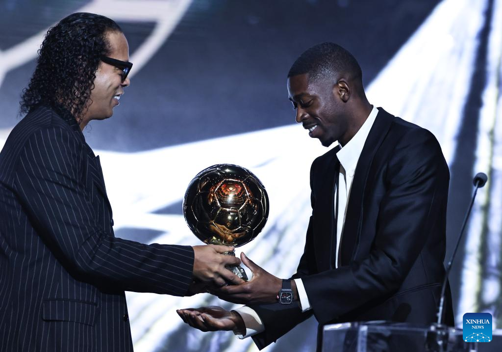 Paris Saint-Germain's French player Ousmane Dembele (R) receives the Ballon d'Or award from Brazilian former football player Ronaldinho during the 2025 Ballon d'Or France Football award ceremony at the Theatre du Chatelet in Paris, France, on Sept. 22, 2025. (Xinhua/Gao Jing)