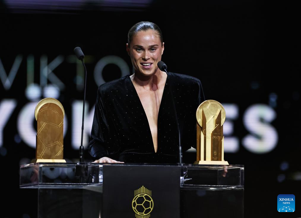 FC Barcelona's Polish player Ewa Pajor speaks after winning the Gerd Muller Trophy for best striker during the 2025 Ballon d'Or France Football award ceremony at the Theatre du Chatelet in Paris, France, on Sept. 22, 2025. (Xinhua/Gao Jing)