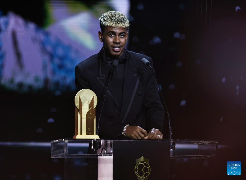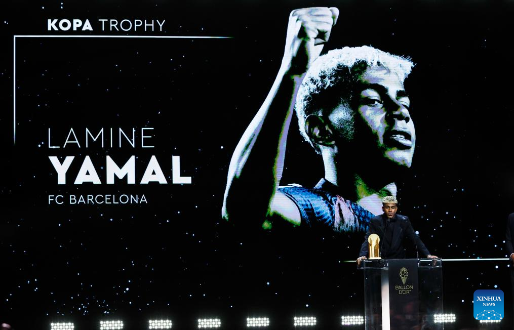 Barcelona's Spanish player Lamine Yamal speaks after receiving the Kopa Trophy for the best under-21 player during the 2025 Ballon d'Or France Football award ceremony at the Theatre du Chatelet in Paris, France, on Sept. 22, 2025. (Xinhua/Gao Jing)