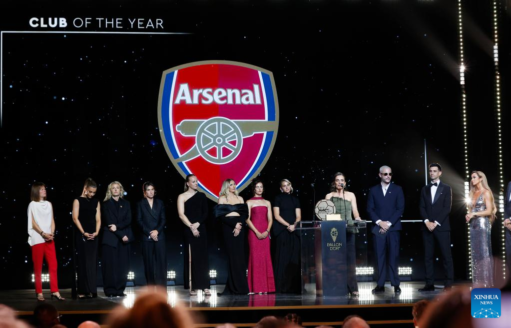Arsenal's Dutch head coach Renee Slegers (4th R) makes a speech after winning the 2025 Ballon d'Or women's club of the year award during the 2025 Ballon d'Or France Football award ceremony at the Theatre du Chatelet in Paris, France, on Sept. 22, 2025. (Xinhua/Gao Jing)