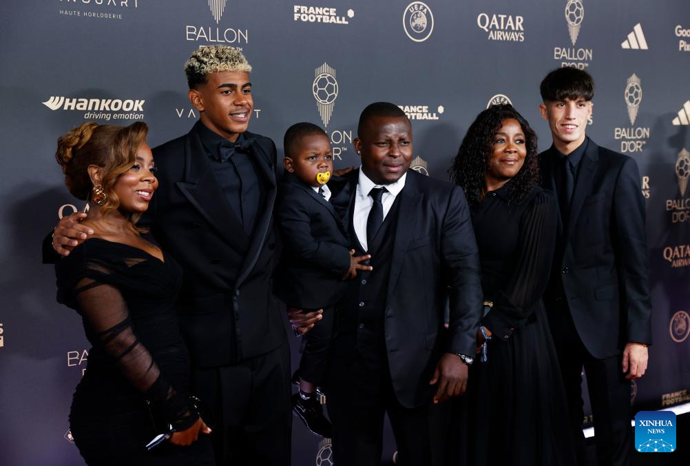 Barcelona's Spanish player Lamine Yamal (2nd L) arrives on the red carpet before the 2025 Ballon d'Or France Football award ceremony at the Theatre du Chatelet in Paris, France, on Sept. 22, 2025. (Xinhua/Gao Jing)