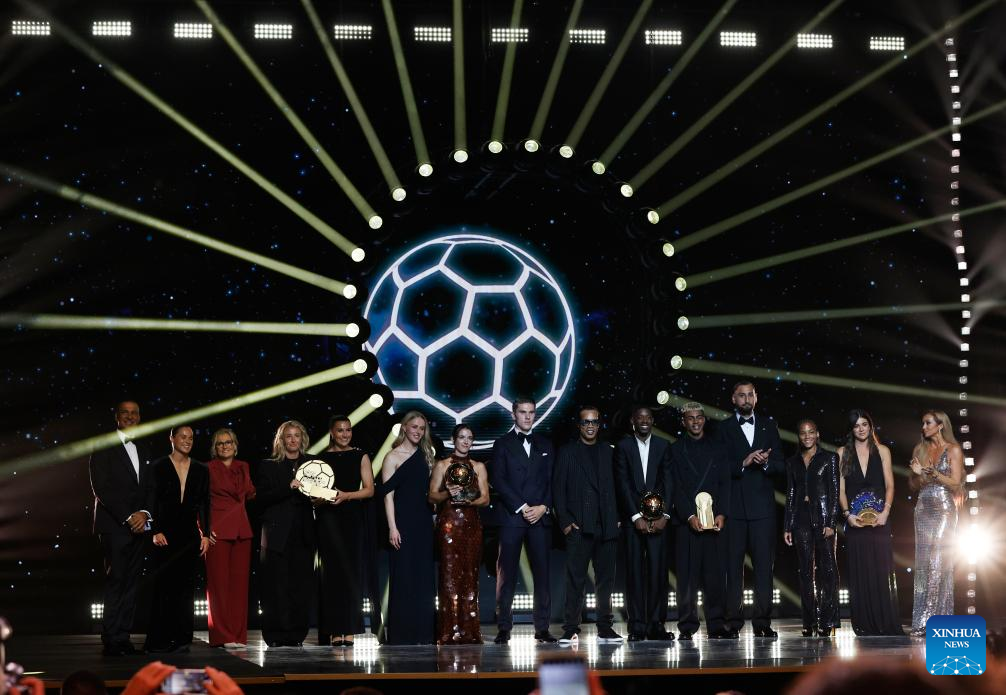 Winners of the 2025 Ballon d'Or France Football awards pose for photo during the 2025 Ballon d'Or France Football award ceremony at the Theatre du Chatelet in Paris, France, on Sept. 22, 2025. (Xinhua/Gao Jing)