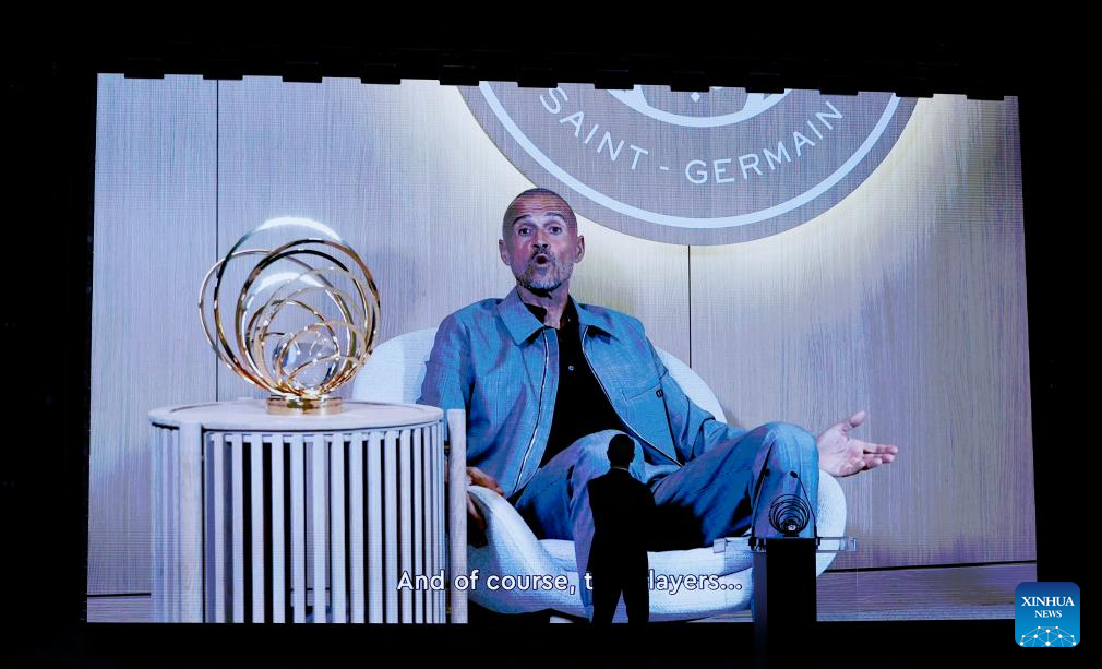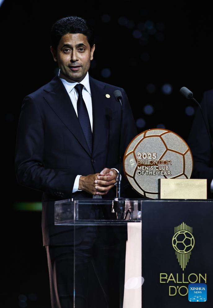 Paris Saint Germain's Qatari president Nasser al-Khelaifi gives a speech after the PSG won the best men's football club of the year award during the 2025 Ballon d'Or France Football award ceremony at the Theatre du Chatelet in Paris, France, on Sept. 22, 2025. (Xinhua/Gao Jing)