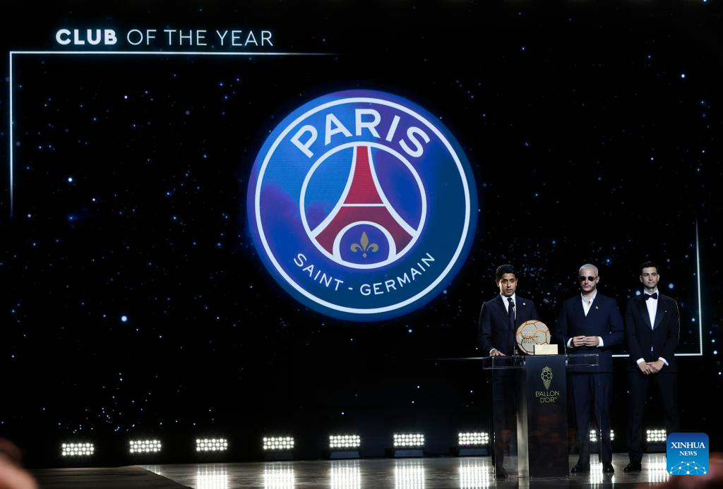 Paris Saint Germain's Qatari president Nasser al-Khelaifi (L) gives a speech after the PSG won the best men's football club of the year award during the 2025 Ballon d'Or France Football award ceremony at the Theatre du Chatelet in Paris, France, on Sept. 22, 2025. (Xinhua/Gao Jing)
