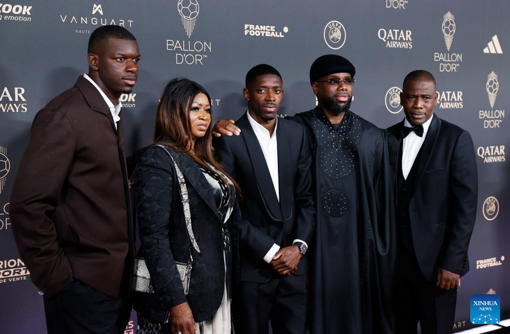 Paris Saint-Germain's French player Ousmane Dembele (C) poses for a photo with his family on the red carpet before the 2025 Ballon d'Or France Football award ceremony at the Theatre du Chatelet in Paris, France, on Sept. 22, 2025. (Xinhua/Gao Jing)