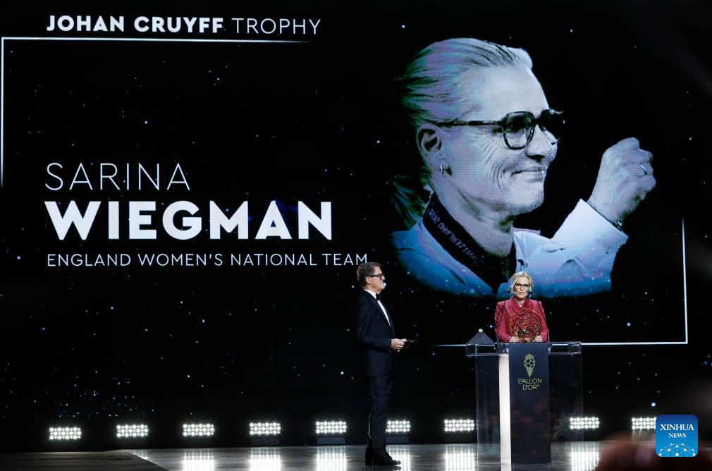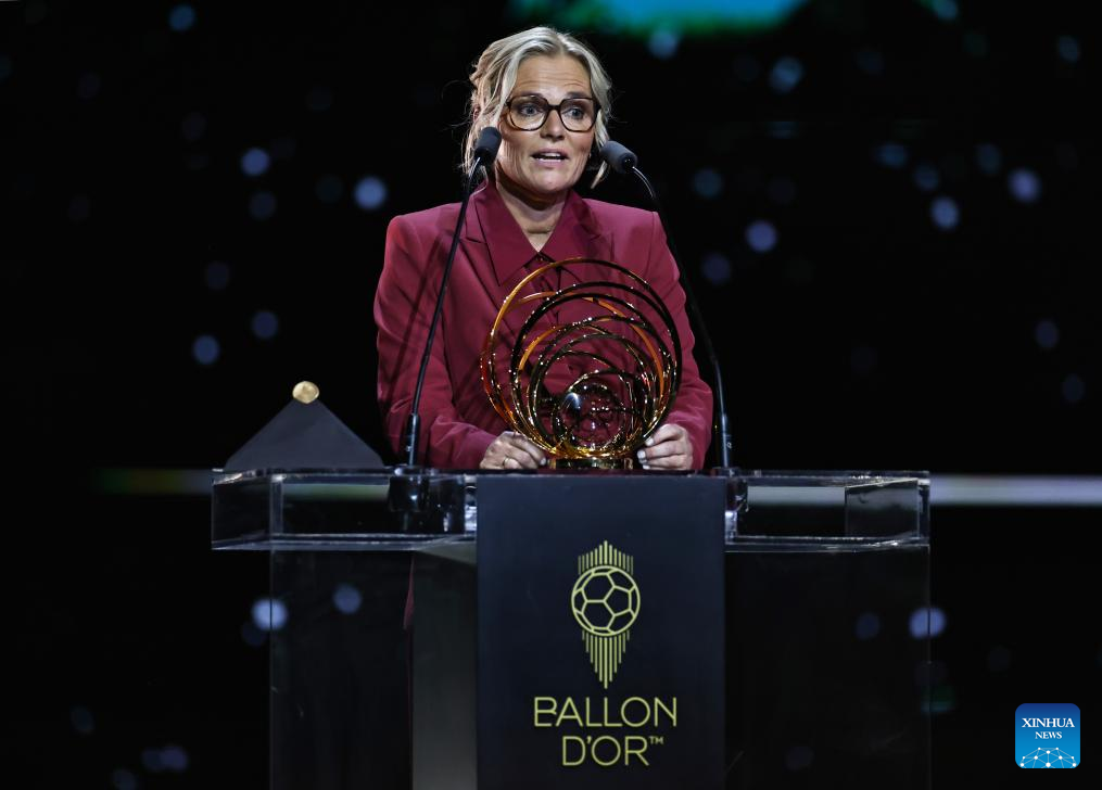 England's football team's Dutch head coach Sarina Wiegman (R) speaks after receiving the Johan Cruyff Best Women's Club team's Head Coach during the 2025 Ballon d'Or France Football award ceremony at the Theatre du Chatelet in Paris, France, on Sept. 22, 2025. (Xinhua/Gao Jing)