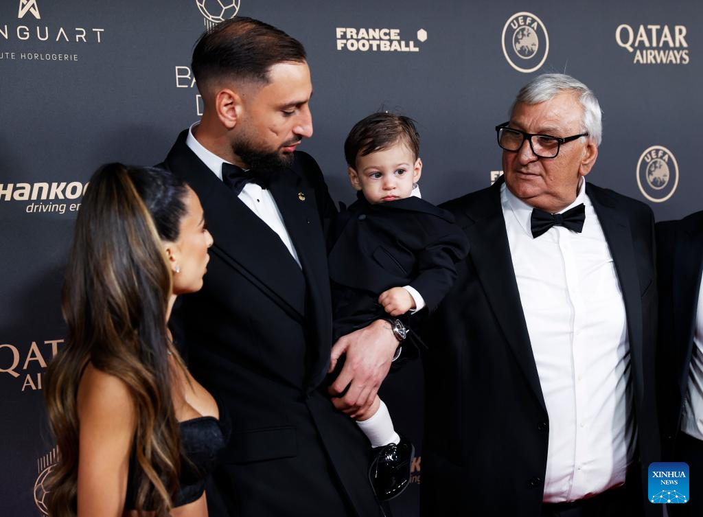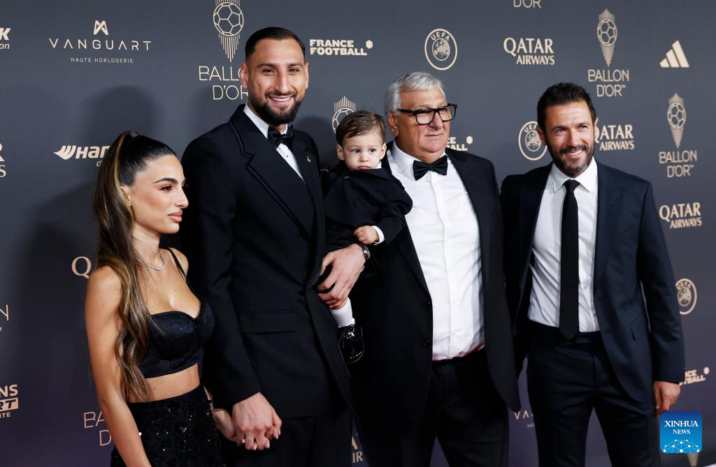 Manchester City's Italian goalkeeper Gianluigi Donnarumma (2nd L) poses for a photo with his family before the 2025 Ballon d'Or France Football award ceremony at the Theatre du Chatelet in Paris, France, on Sept. 22, 2025. (Xinhua/Gao Jing)