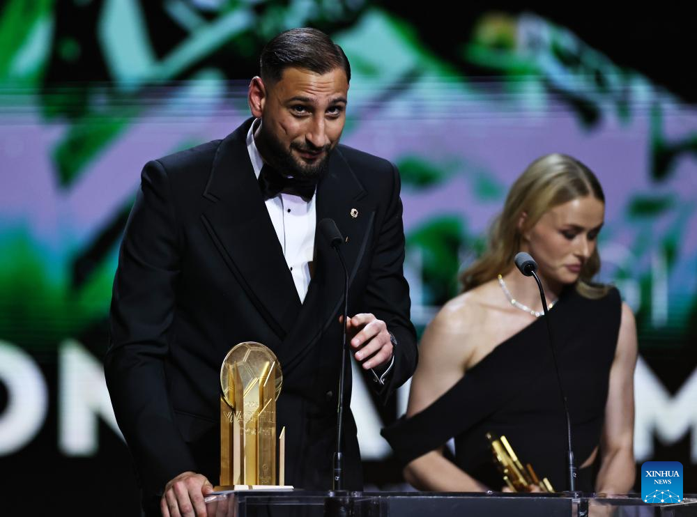 Manchester City's Italian goalkeeper Gianluigi Donnarumma speaks after receiving the Yashin Trophy for the best goalkeepers during the 2025 Ballon d'Or France Football award ceremony at the Theatre du Chatelet in Paris, France, on Sept. 22, 2025. (Xinhua/Gao Jing)