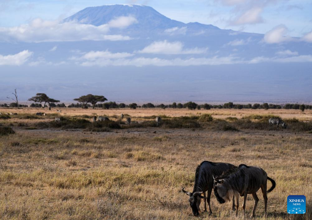This photo taken on Sept. 21, 2025 shows wildebeests with Mount Kilimanjaro in the background at Amboseli National Park in Kajiado County, Kenya. Located at the border between Kenya and Tanzania and at the foot of Africa's highest peak Mount Kilimanjaro, the park is known for its unique scenery and is one of the best places in Kenya to see various wild animals. (Xinhua/Li Yahui)