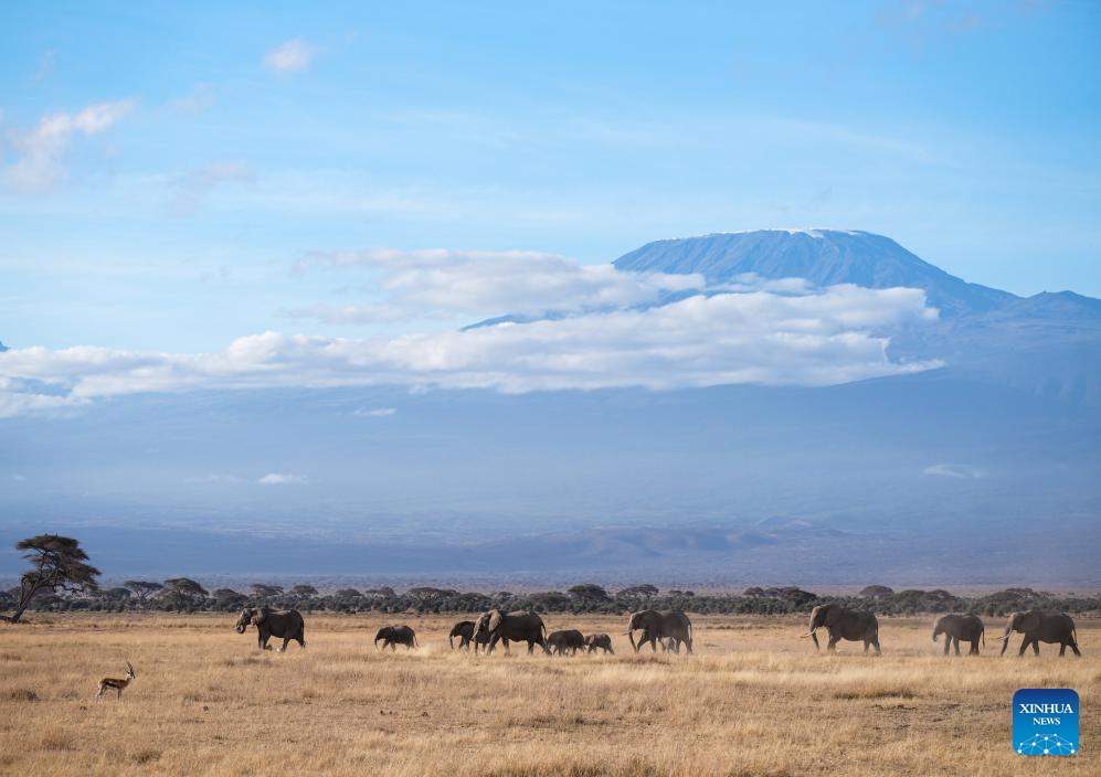 This photo taken on Sept. 20, 2025 shows elephants at Amboseli National Park in Kajiado County, Kenya. Located at the border between Kenya and Tanzania and at the foot of Africa's highest peak Mount Kilimanjaro, the park is known for its unique scenery and is one of the best places in Kenya to see various wild animals. (Xinhua/Li Yahui)