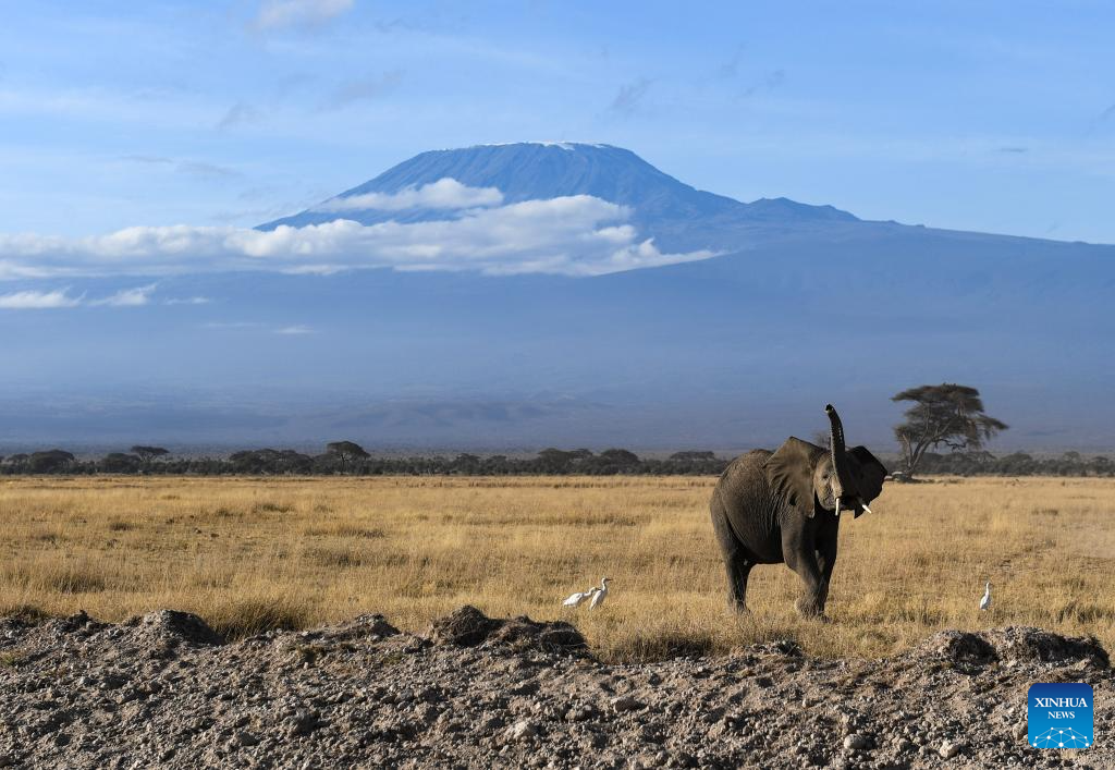 This photo taken on Sept. 21, 2025 shows an elephant with Mount Kilimanjaro in the background at Amboseli National Park in Kajiado County, Kenya. Located at the border between Kenya and Tanzania and at the foot of Africa's highest peak Mount Kilimanjaro, the park is known for its unique scenery and is one of the best places in Kenya to see various wild animals. (Xinhua/Li Yahui)