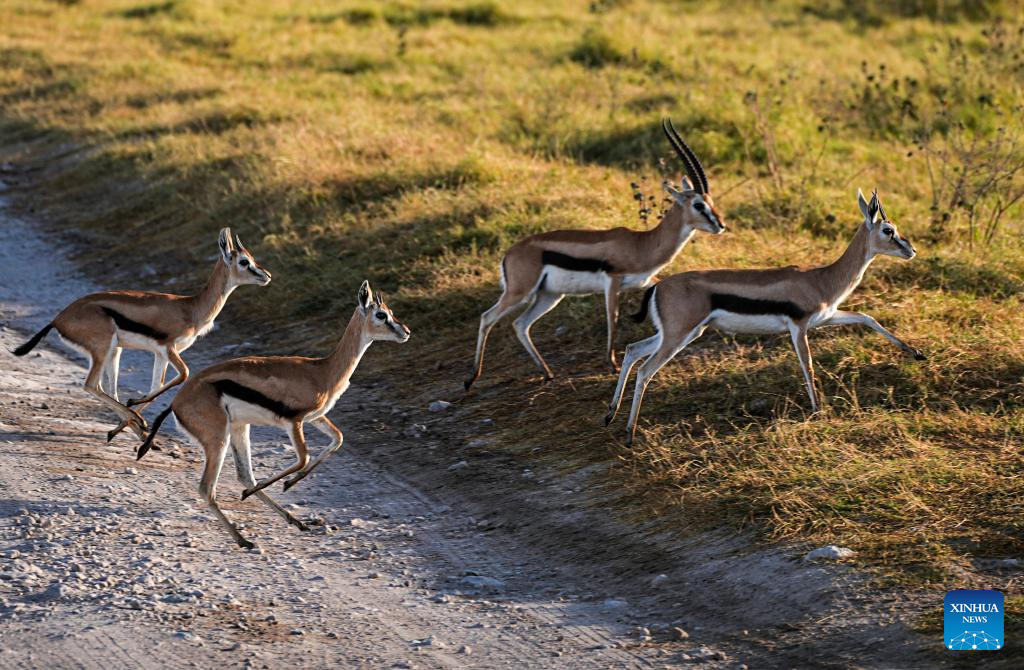 Gazelles leap across a road at Amboseli National Park in Kajiado County, Kenya, Sept. 21, 2025. Located at the border between Kenya and Tanzania and at the foot of Africa's highest peak Mount Kilimanjaro, the park is known for its unique scenery and is one of the best places in Kenya to see various wild animals. (Xinhua/Li Yahui)