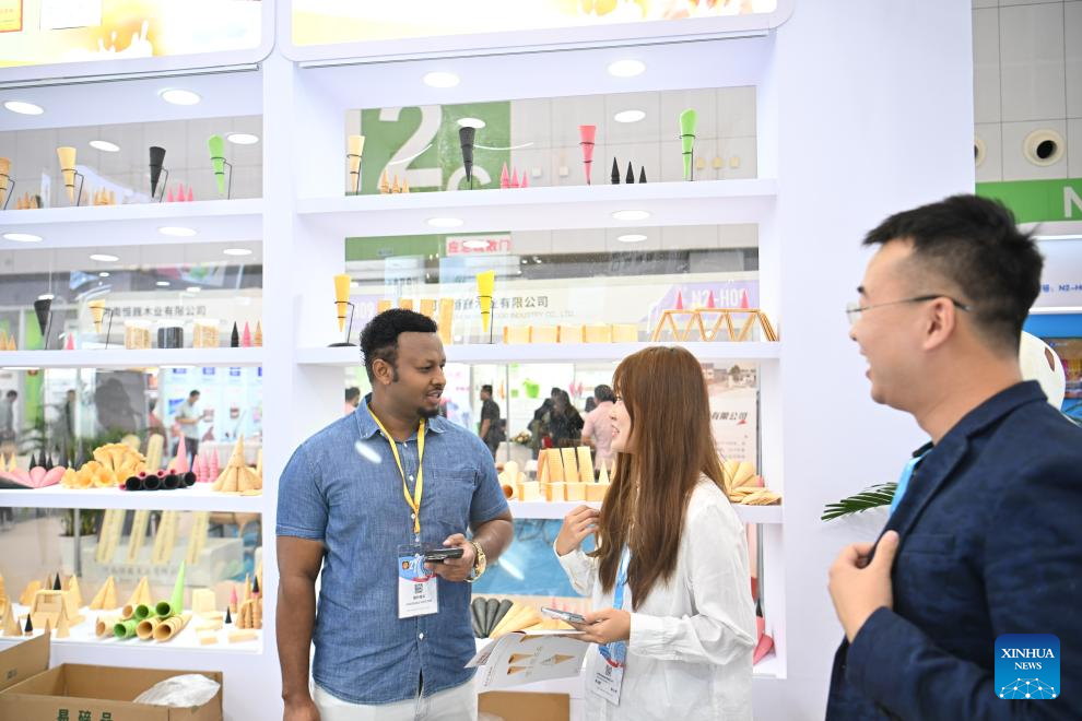 An exhibitor communicates with an Ethiopian merchant (L) at the Ice Cream China 2025 in north China's Tianjin Municipality, Sept. 24, 2025. The three-day Ice Cream China 2025 kicked off here on Wednesday, attracting more than 500 companies from home and abroad. (Xinhua/Sun Fanyue)