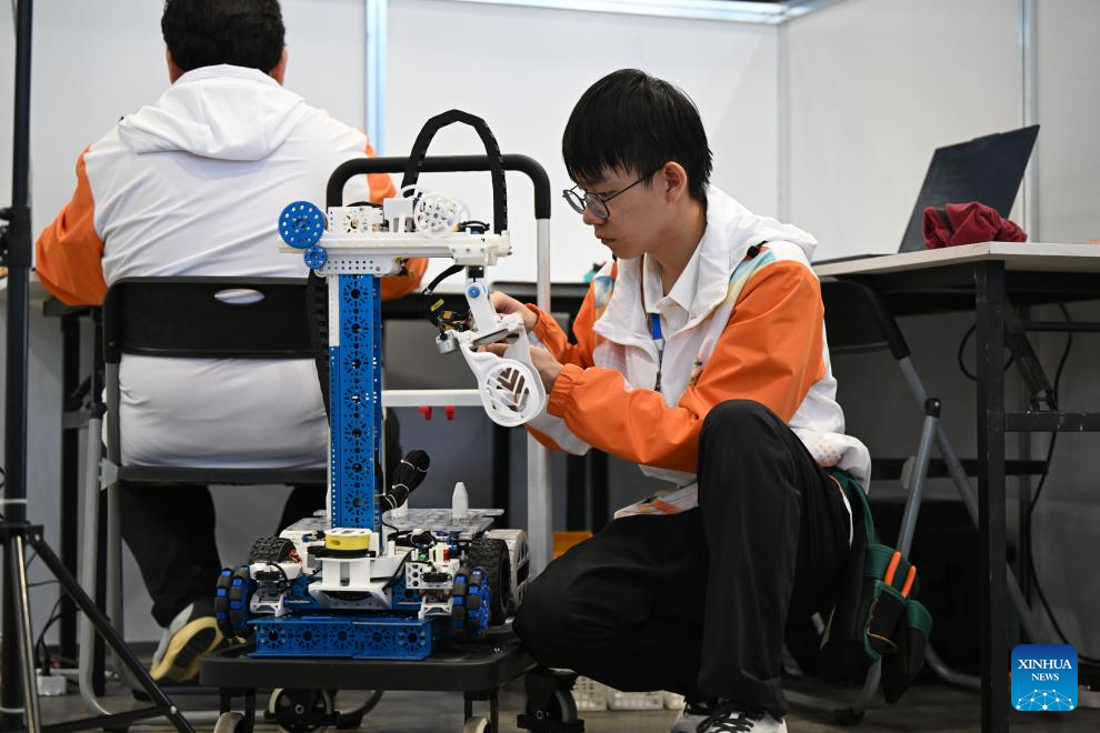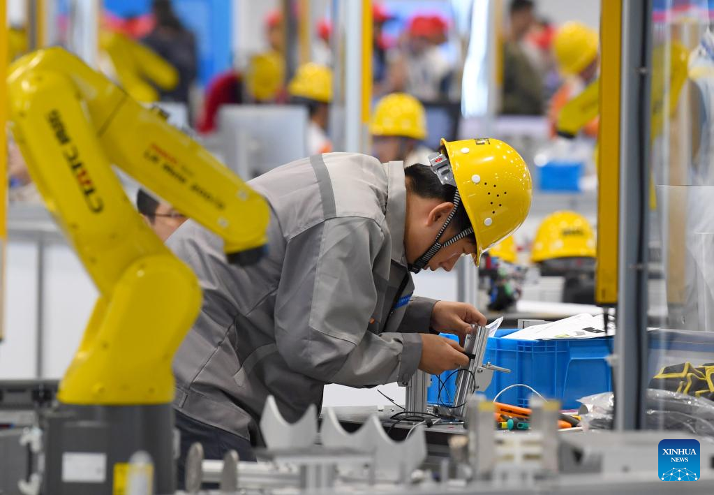 A contestant participates in a robot systems integration event during the third Vocational Skills Competition in Zhengzhou, central China's Henan Province, Sept. 20, 2025.