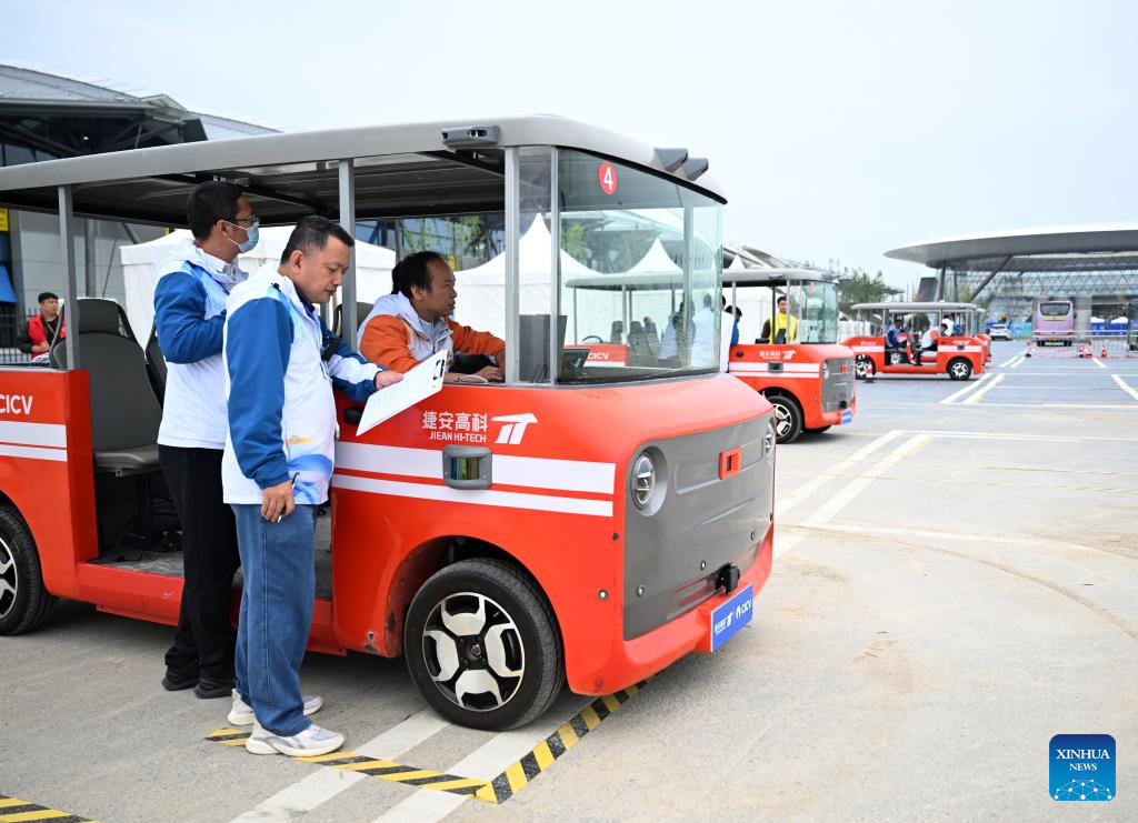 A staff member debugs vehicles to be used in an intelligent connected vehicle operation and maintenance event during the third Vocational Skills Competition in Zhengzhou, central China's Henan Province, Sept. 20, 2025.