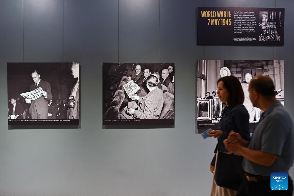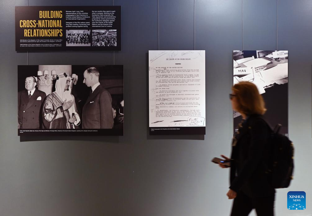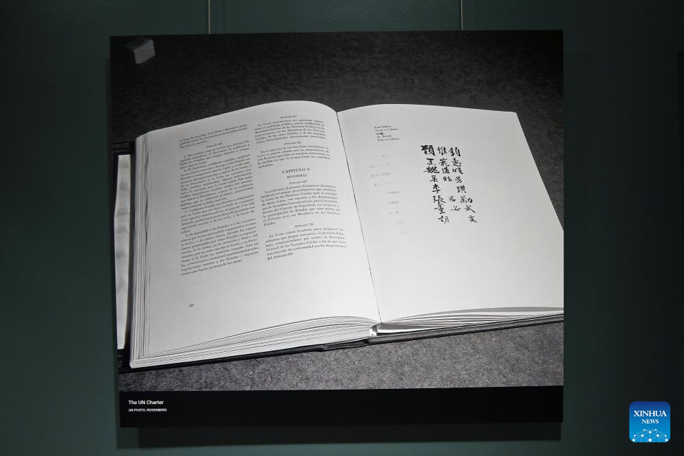 Picture taken on Sept. 18, 2025 shows a photo of the UN Charter exhibited during an exhibition themed "Reviving the Spirit of San Francisco" at the United Nations headquarters in New York. This year marks the 80th anniversary of the founding of the United Nations. (Xinhua/Li Rui)