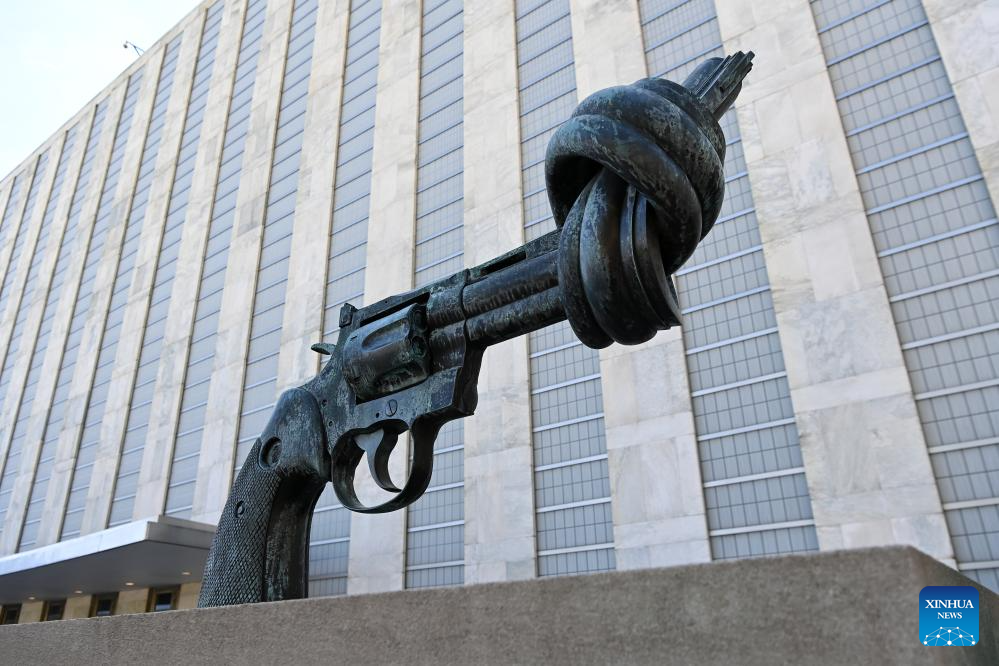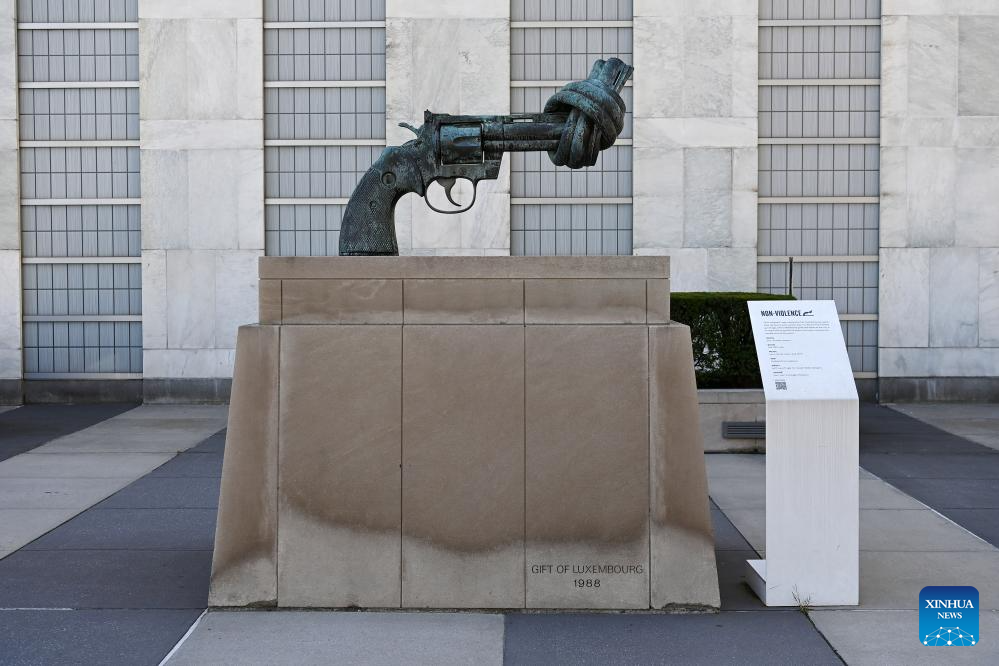This photo taken on Sept. 18, 2025 shows a sculpture titled "Non-Violence" at the United Nations headquarters in New York. This year marks the 80th anniversary of the founding of the United Nations. (Xinhua/Li Rui)