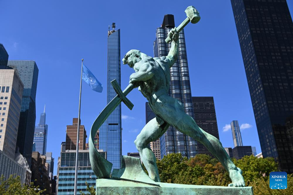 This photo taken on Sept. 18, 2025 shows a sculpture titled "Let Us Beat Swords Into Ploughshares" at the United Nations headquarters in New York. This year marks the 80th anniversary of the founding of the United Nations. (Xinhua/Li Rui)