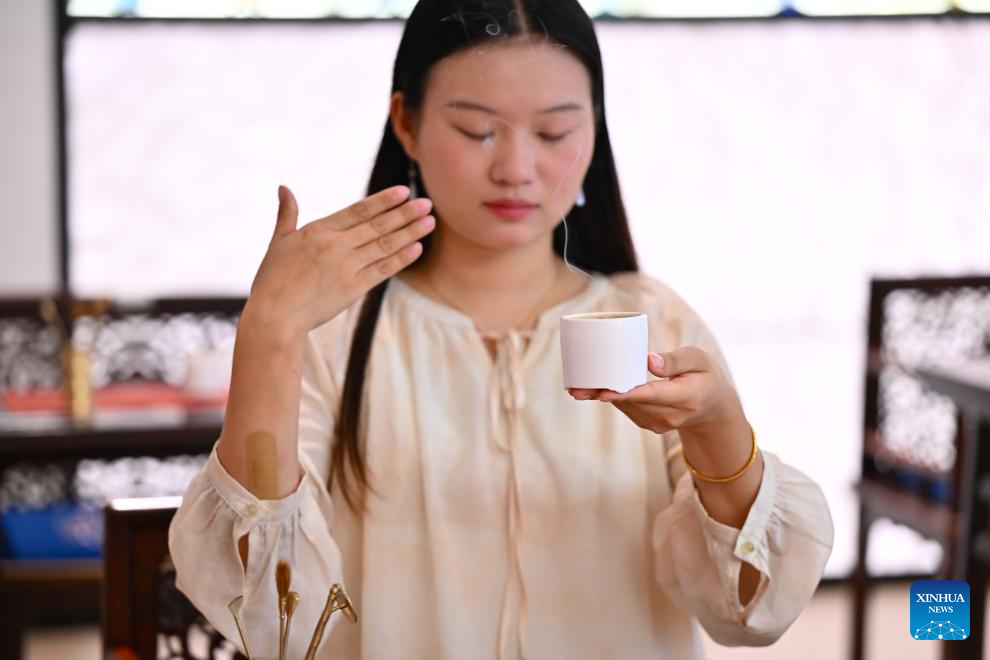 A staff member demonstrates the proper move of smelling incense at an agarwood museum in Xianyou County, southeast China's Fujian Province, on Sept. 24, 2025. Xianyou County is a significant trading and distribution center for agarwood and sandalwood in China. In recent years, the county has been working on the development of its incense-related business by leveraging the abundance in raw materials, a mature incense-making industrial chain, and online and offline sales networks there.