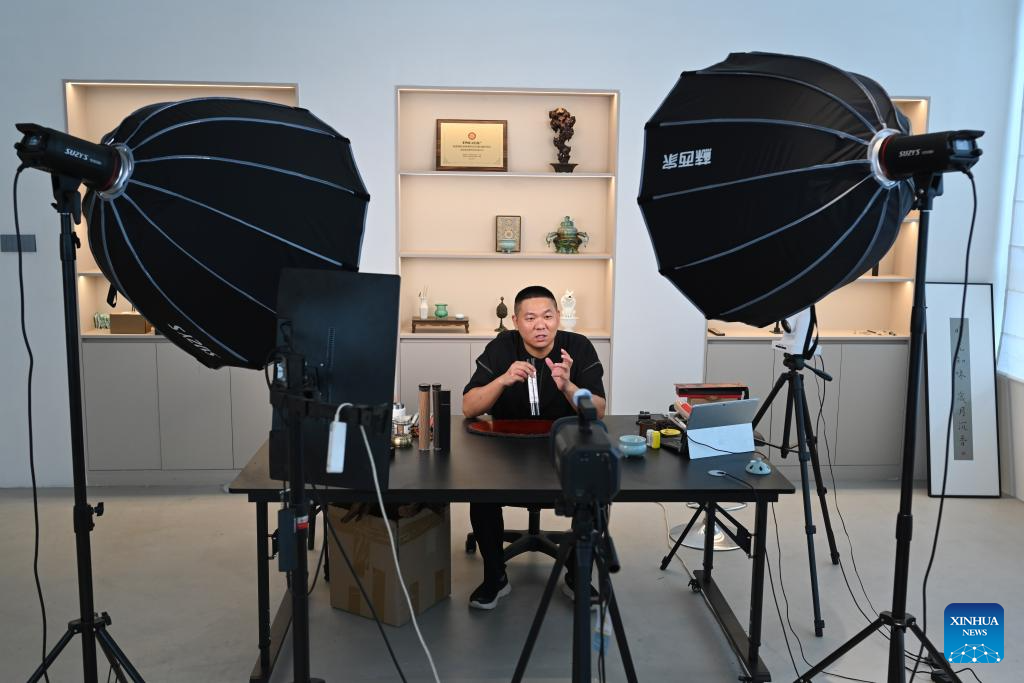 A manager of an incense-making enterprise introduces natural incense products during a live streaming session in Xianyou County, southeast China's Fujian Province, on Sept. 24, 2025. Xianyou County is a significant trading and distribution center for agarwood and sandalwood in China. In recent years, the county has been working on the development of its incense-related business by leveraging the abundance in raw materials, a mature incense-making industrial chain, and online and offline sales networks there.