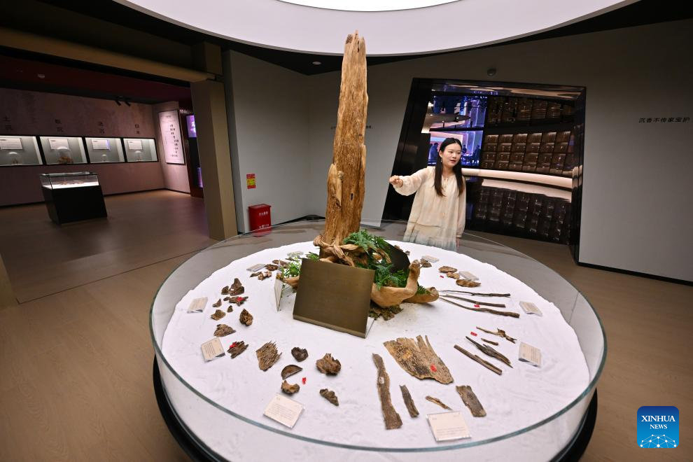 A staff member introduces the agarwood raw materials for making natural incense at an agarwood museum in Xianyou County, southeast China's Fujian Province, on Sept. 24, 2025. Xianyou County is a significant trading and distribution center for agarwood and sandalwood in China. In recent years, the county has been working on the development of its incense-related business by leveraging the abundance in raw materials, a mature incense-making industrial chain, and online and offline sales networks there.