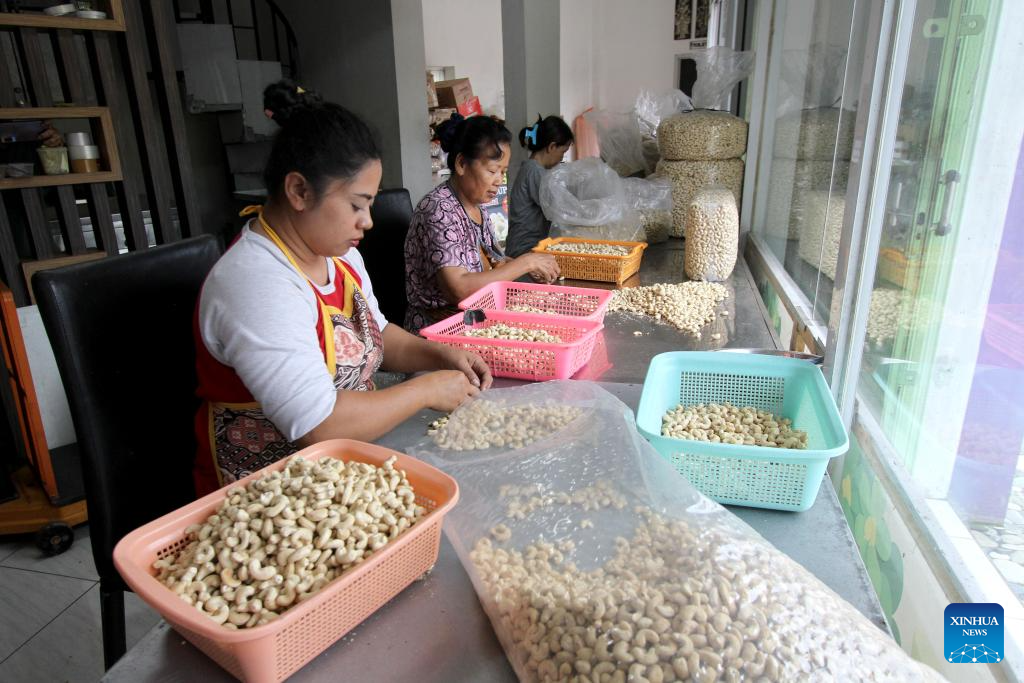 A worker packs peeled cashew nuts at a family workshop in Tanjung Sari village of Wonogiri regency, Central Java, Indonesia, Sept. 24, 2025. Indonesia has allocated 9.9 trillion rupiahs (around 604 million U.S. dollars) to strengthen the downstreaming of key plantation commodities and improve farmer welfare.
