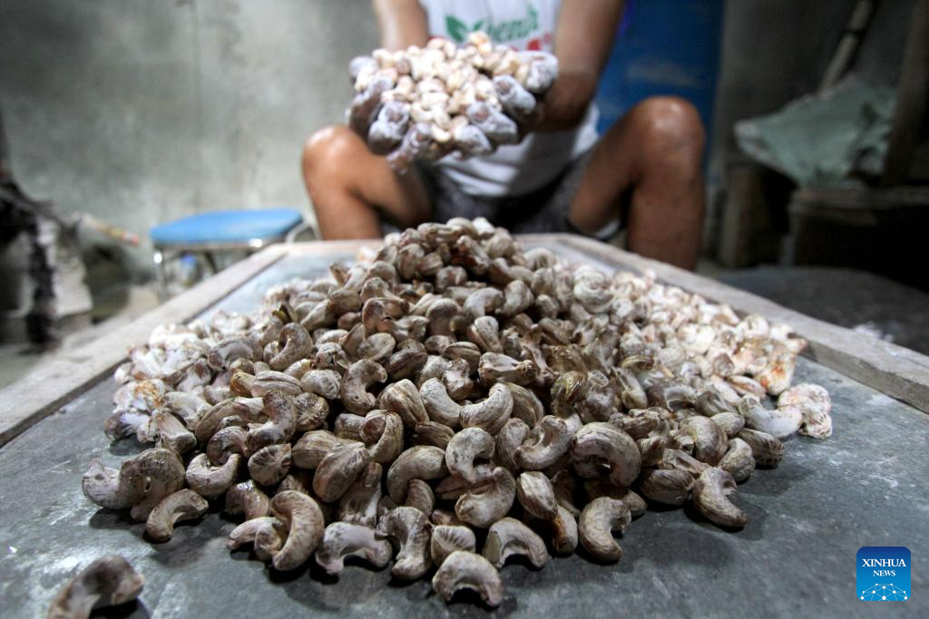 A worker displays raw cashew nuts in Mojopakel village of Wonogiri regency, Central Java, Indonesia, Sept. 24, 2025. Indonesia has allocated 9.9 trillion rupiahs (around 604 million U.S. dollars) to strengthen the downstreaming of key plantation commodities and improve farmer welfare.