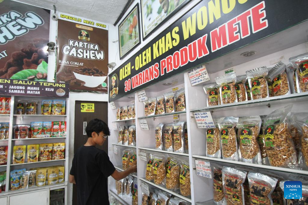 A costumer selects cashew nuts products displayed at a store in Tanjung Sari village of Wonogiri regency, Central Java, Indonesia, Sept. 24, 2025. Indonesia has allocated 9.9 trillion rupiahs (around 604 million U.S. dollars) to strengthen the downstreaming of key plantation commodities and improve farmer welfare.
