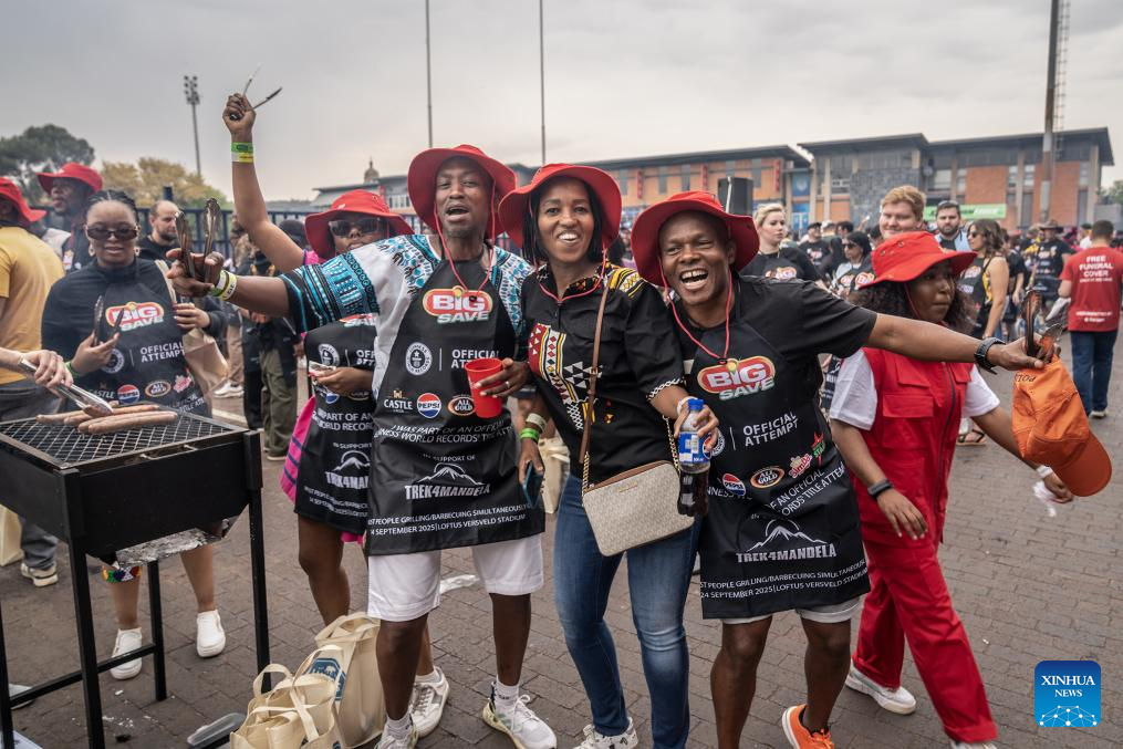 People pose for photos at a barbecue festival held at Loftus Stadium of Pretoria, South Africa, on Sept. 24, 2025. South Africans commemorate this year's Heritage Day with a large braai (barbecue) festival here on Wednesday, attracting over 2000 people to participate. (Photo by Shiraaz Mohamed/Xinhua)