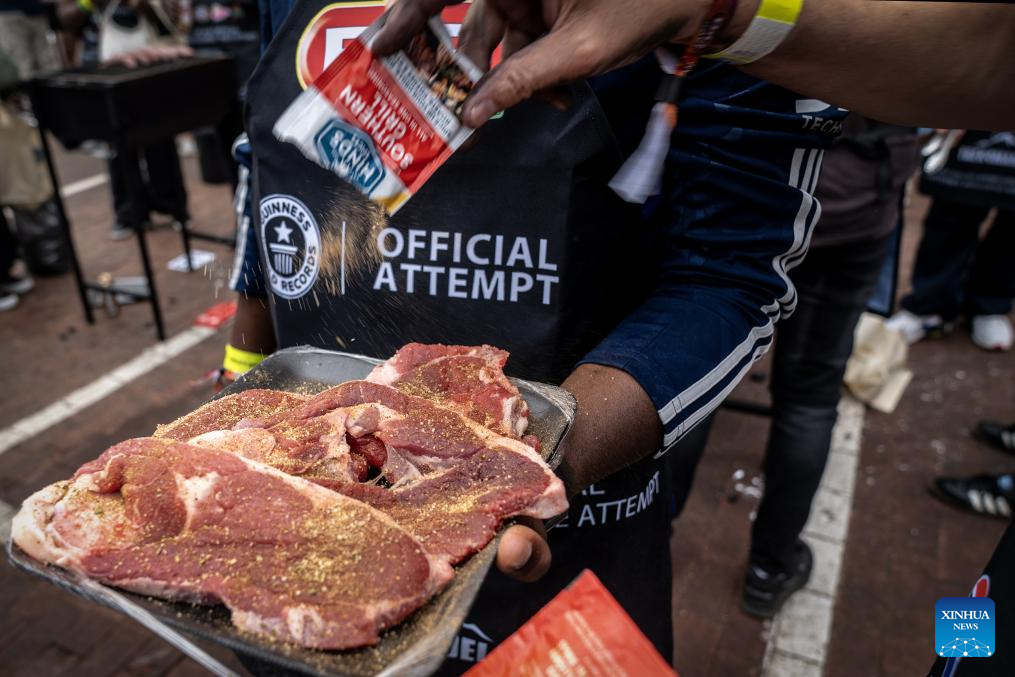 A man pours spice over the meat about to be cooked at a barbecue festival held at Loftus Stadium of Pretoria, South Africa, on Sept. 24, 2025. South Africans commemorate this year's Heritage Day with a large braai (barbecue) festival here on Wednesday, attracting over 2000 people to participate. (Photo by Shiraaz Mohamed/Xinhua)