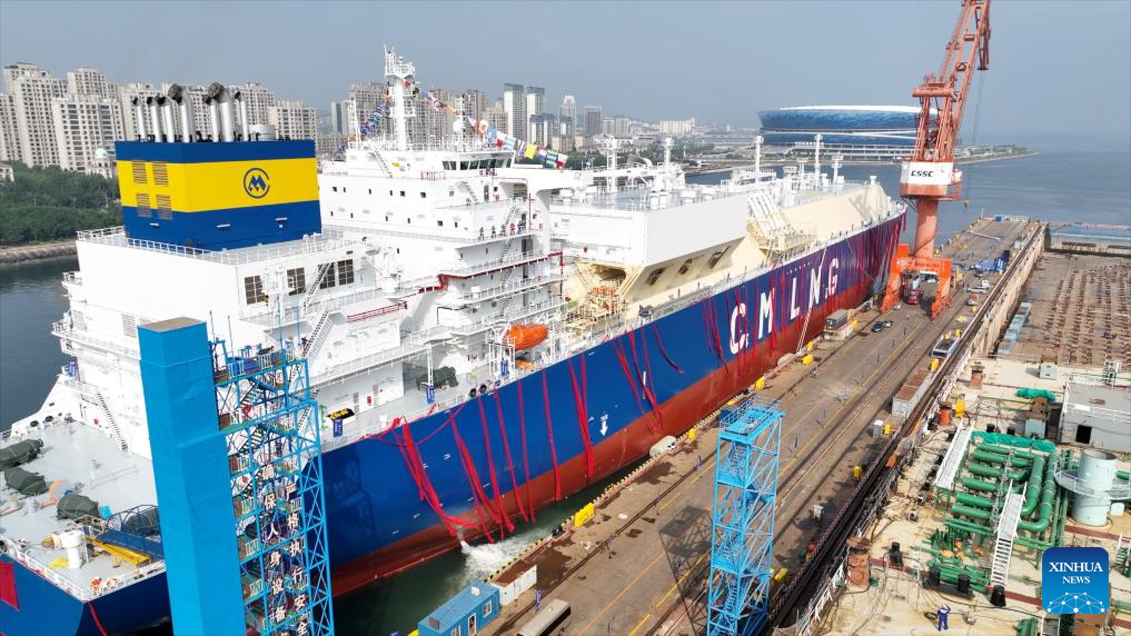 An aerial drone photo taken on Sept. 24, 2025 shows the SEA SPIRIT large liquefied natural gas (LNG) carrier at a dock of Dalian Shipbuilding Industry Co., Ltd. in Dalian, northeast China's Liaoning Province. (The Dalian Shipbuilding Industry Co., Ltd./Handout via Xinhua)