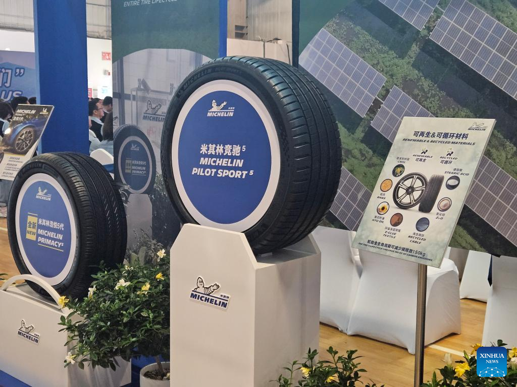 This photo taken on Sept. 24, 2025 shows products on display at the 30th anniversary ceremony of Michelin Shenyang Tire Company Ltd. in Shenyang, northeast China's Liaoning Province. (Xinhua/Yu Yetong)