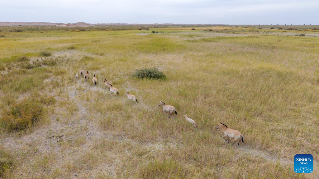 Przewalski's horses are pictured in the Dunhuang West Lake National Nature Reserve in Dunhuang, northwest China's Gansu Province, on Sept. 24, 2025. The Dunhuang West Lake National Nature Reserve in Gansu Province covers an area of approximately 660,000 hectares, featuring a diverse ecosystem including wetlands, grasslands, forests and Gobi deserts, which makes it an experimental zone for the wild release of the Przewalski's horses.