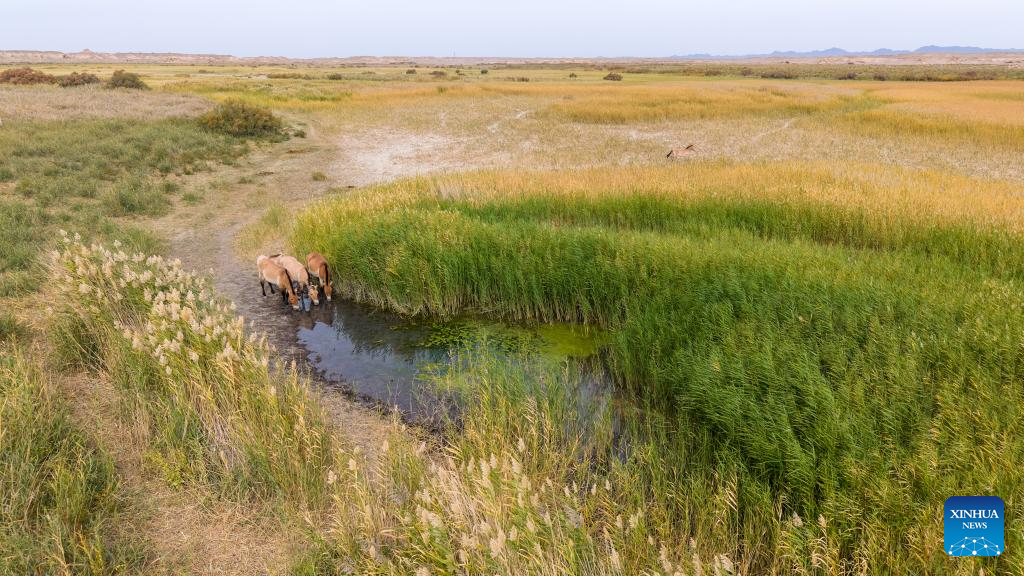 An aerial drone photo taken on Sept. 24, 2025 shows Przewalski's horses drinking water in the Dunhuang West Lake National Nature Reserve, in Dunhuang, northwest China's Gansu Province. The Dunhuang West Lake National Nature Reserve in Gansu Province covers an area of approximately 660,000 hectares, featuring a diverse ecosystem including wetlands, grasslands, forests and Gobi deserts, which makes it an experimental zone for the wild release of the Przewalski's horses.
