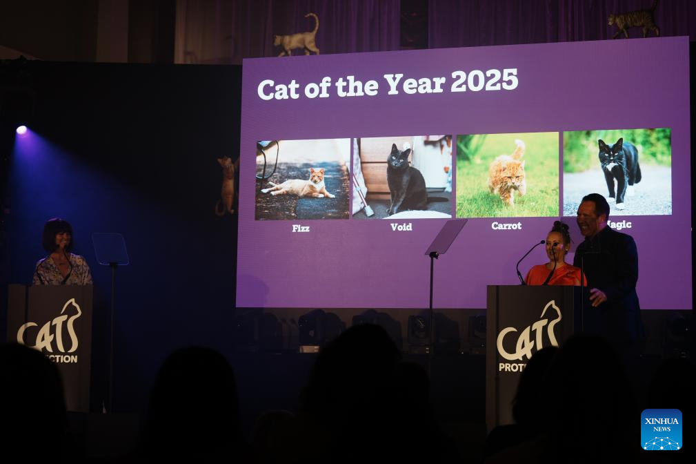 Representatives collect an award as Fizz, a four-year-old ginger tom from Powys, Wales, wins the "Cat of the Year 2025" award of the National Cat Awards 2025 at an awarding ceremony in London, Britain, Sept. 24, 2025. Tales of extraordinary cats and their owners' journeys of hope and healing took center stage in London on Wednesday night, at a ceremony hosted by the century-old British charity Cats Protection for the 17th National Cat Awards.