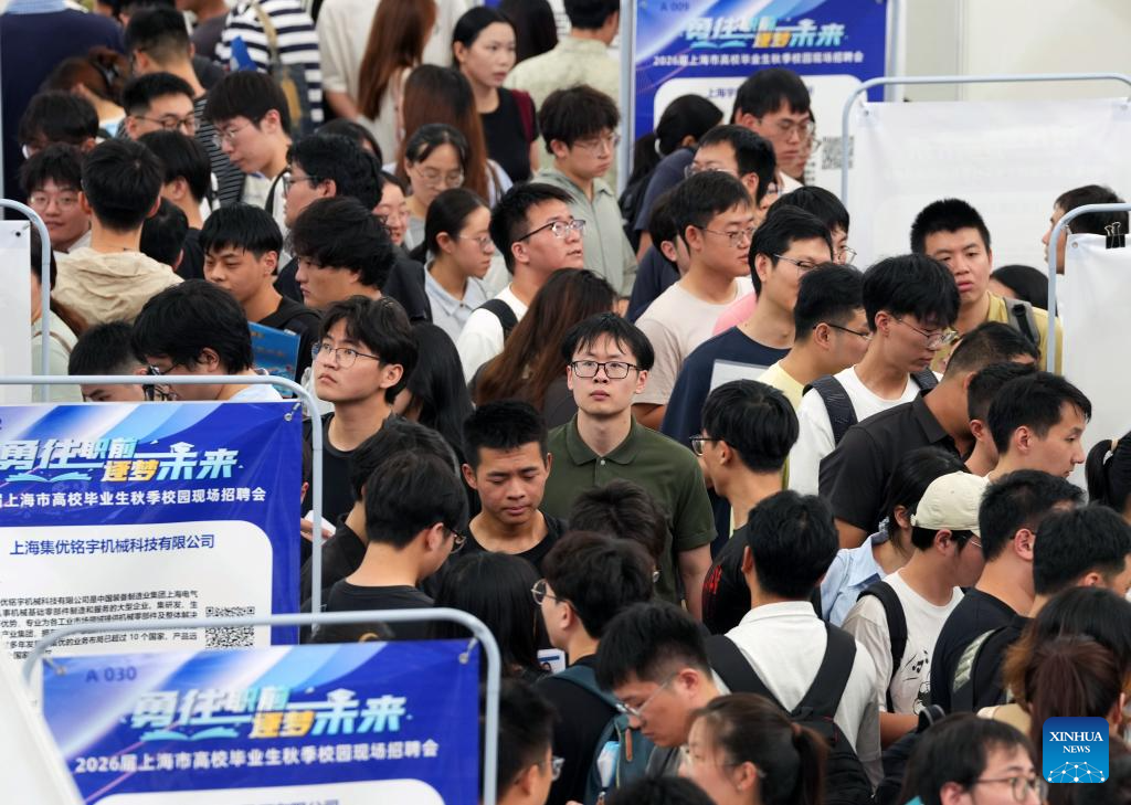 This photo taken on Sept. 26, 2025 shows a scene at an autumn campus job fair for Shanghai university graduates at the Minhang campus of Shanghai Jiao Tong University in east China's Shanghai. The job fair kicked off here on Friday, with the participation of more than 1,000 employers and providing about 35,000 jobs. (Xinhua/Liu Ying)