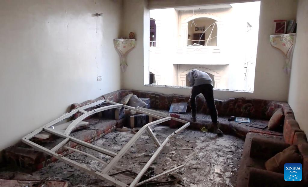 A man inspects his house after an Israeli attack struck a residential area in Sanaa, Yemen, on Sept. 25, 2025. The death toll from Israeli airstrikes on Yemen's capital Sanaa on Thursday rose to eight, with 142 others wounded, Houthi-run health authorities said, adding that rescue teams were still searching for survivors under the rubble. (Houthi Media Center/Handout via Xinhua)