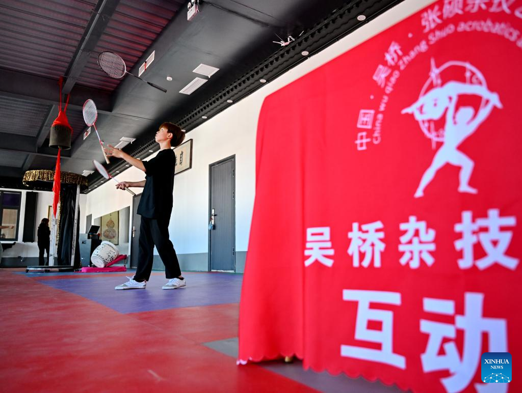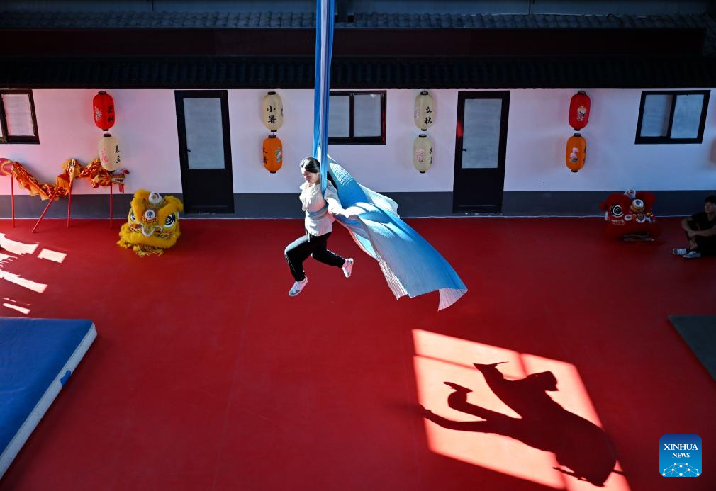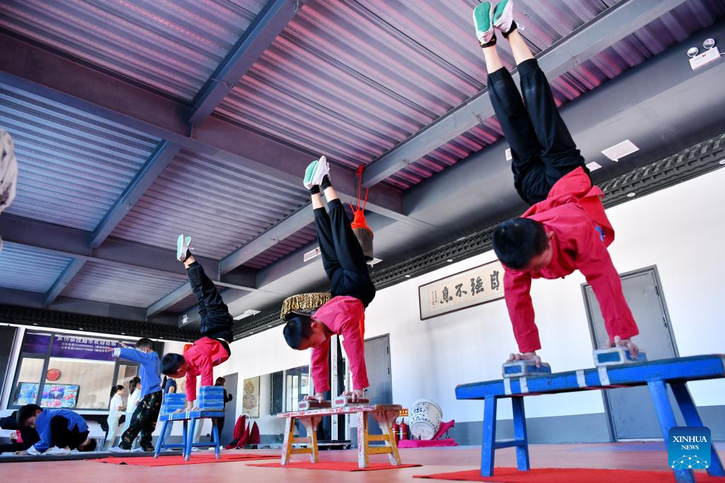 Students practice acrobatic skills at the Diao's Troupe acrobatic courtyard in Sangyuan Town, Wuqiao County, north China's Hebei Province, on Sept. 25, 2025. Wuqiao, dubbed the cradle of Chinese acrobatic art, boasts 14 diverse "acrobatic courtyards" that serve as a cluster of bases for artist training, new play designing, and folk art research. (Xinhua/Mu Yu)