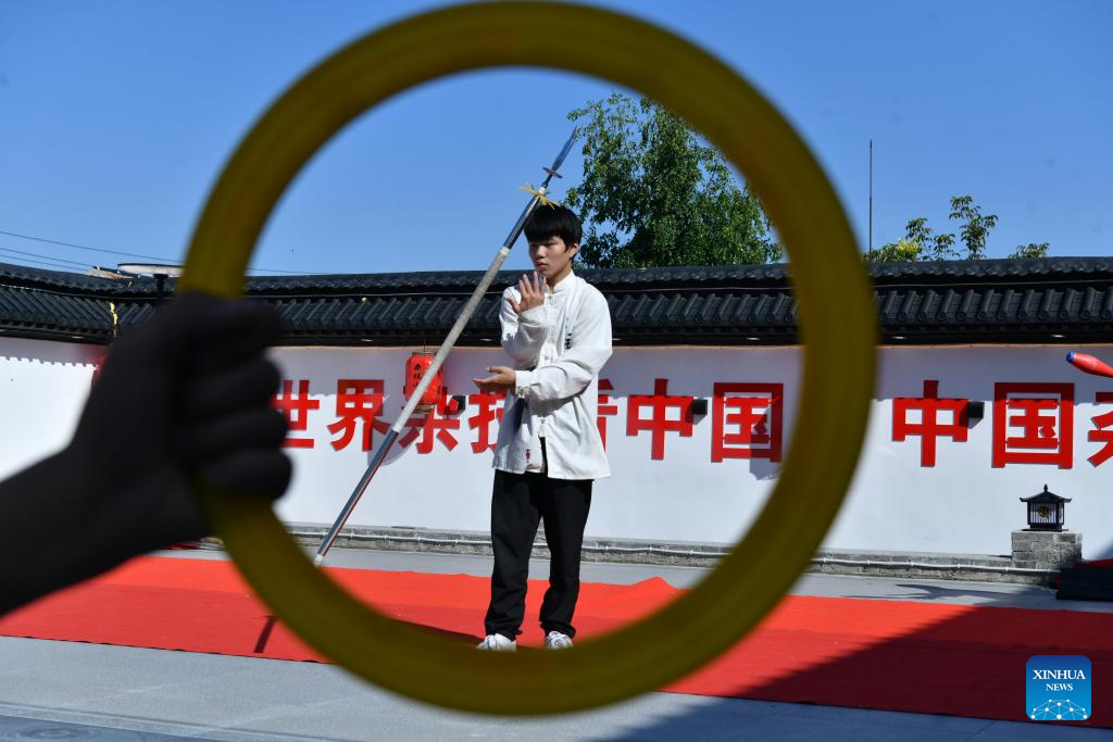 A student practice acrobatic skills at Zhang Shuo's acrobatic courtyard in Sangyuan Town, Wuqiao County, north China's Hebei Province, on Sept. 25, 2025. Wuqiao, dubbed the cradle of Chinese acrobatic art, boasts 14 diverse "acrobatic courtyards" that serve as a cluster of bases for artist training, new play designing, and folk art research. (Xinhua/Mu Yu)