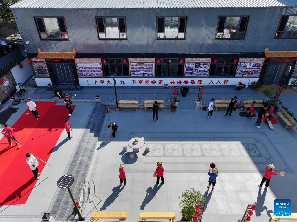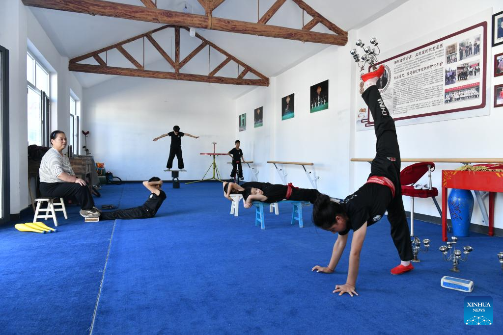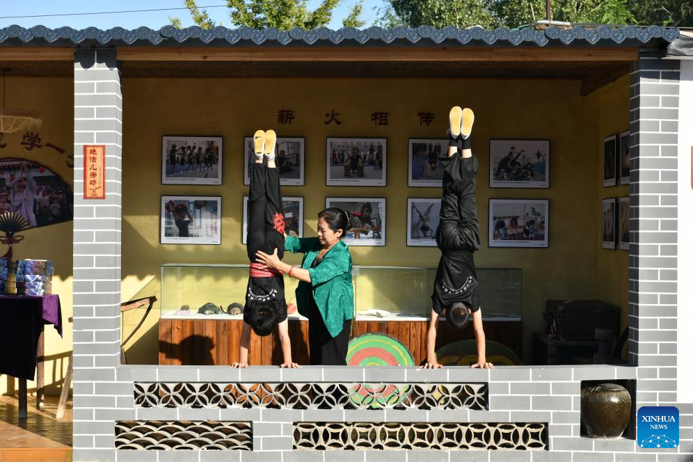 Students practice acrobatic skills at Zhang Shuo's acrobatic courtyard in Sangyuan Town, Wuqiao County, north China's Hebei Province, on Sept. 25, 2025. Wuqiao, dubbed the cradle of Chinese acrobatic art, boasts 14 diverse "acrobatic courtyards" that serve as a cluster of bases for artist training, new play designing, and folk art research. (Xinhua/Mu Yu)