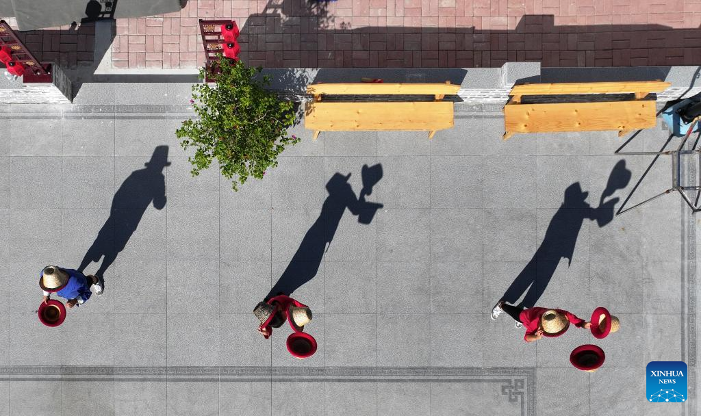 An aerial drone photo taken on Sept. 25, 2025 shows students practicing acrobatic skills at Zhang Shuo's acrobatic courtyard in Sangyuan Town, Wuqiao County, north China's Hebei Province. Wuqiao, dubbed the cradle of Chinese acrobatic art, boasts 14 diverse "acrobatic courtyards" that serve as a cluster of bases for artist training, new play designing, and folk art research. (Xinhua/Mu Yu)