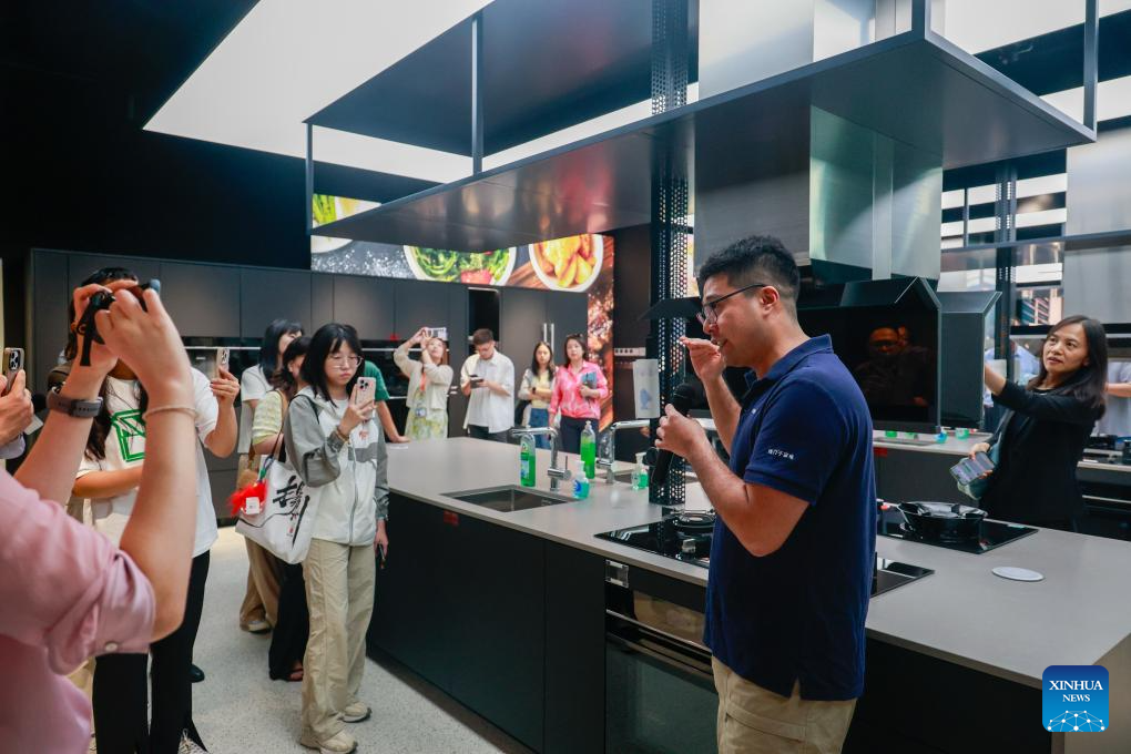 A staff member introduces home appliances to journalists at the BSH Global R&D Center in Nanjing, capital of east China's Jiangsu Province, Sept. 19, 2025. (Xinhua/Liu Jiaqi)
