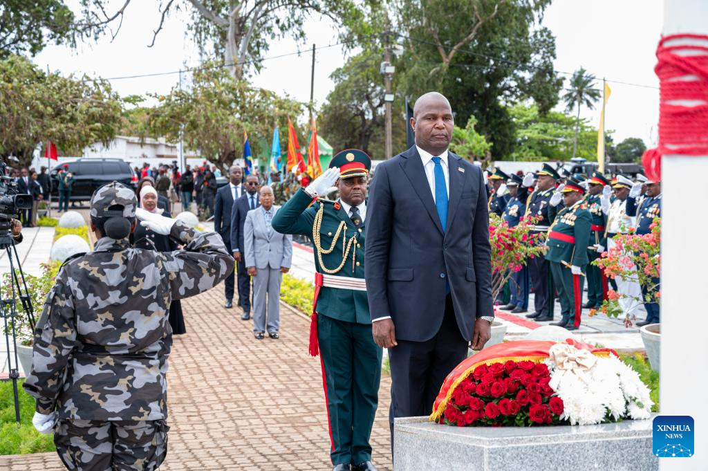 Mozambican President Daniel Chapo lays a wreath at the Heroes' Square during the Armed Forces Day celebrations in Maputo, Mozambique, Sept. 25, 2025. The Armed Forces Day celebrations, which also marked the 61st anniversary of the Mozambique Defense Armed Forces, were held here on Thursday. (Photo by Mendes Mondlane/Xinhua)