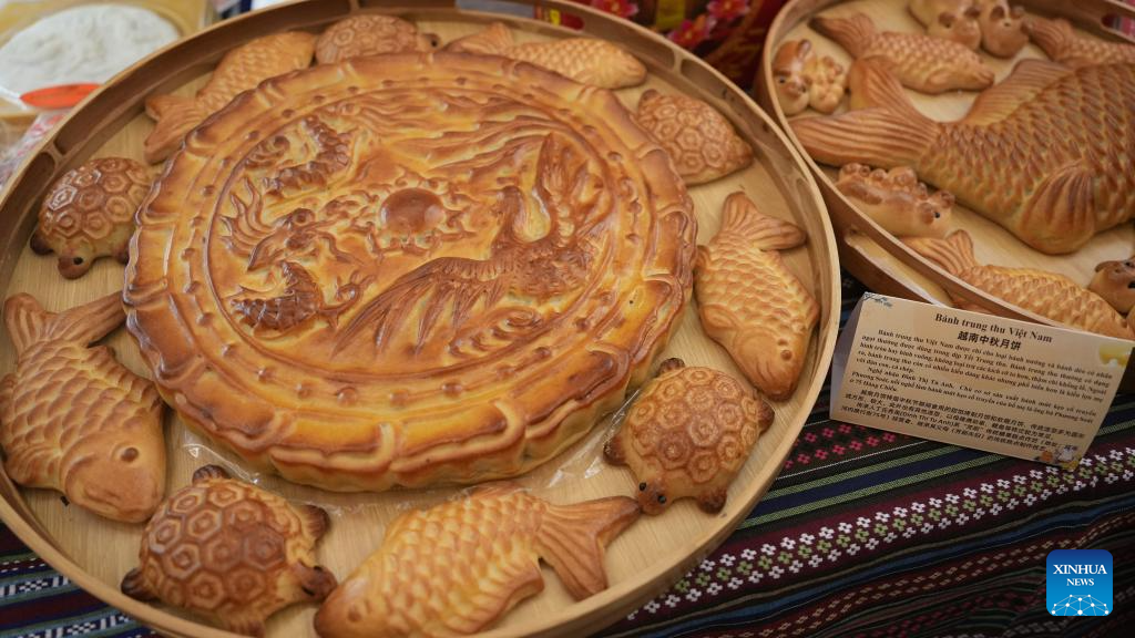 This photo taken on Sept. 25, 2025 shows mooncakes made by Vietnamese mooncake artisan Dinh Thi Tu Anh at the Vietnam National Opera and Ballet in Hanoi, Vietnam. (Xinhua/Hu Jiali)