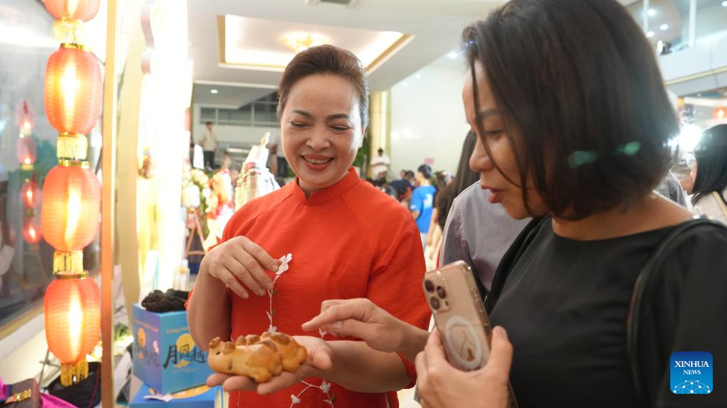 Vietnamese mooncake artisan Dinh Thi Tu Anh communicates with a visitor at the Vietnam National Opera and Ballet in Hanoi, Vietnam, Sept. 25, 2025. (Xinhua/Hu Jiali)