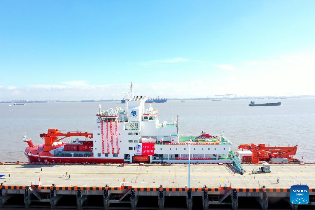A drone photo taken on Sept. 26, 2025 shows China's research icebreaker Xuelong 2 berthed at a dock in Shanghai, east China, Sept. 26, 2025. China's research icebreaker Xuelong 2, or Snow Dragon 2, arrived in Shanghai on Friday, marking the completion of the country's hitherto largest Arctic Ocean scientific expedition.