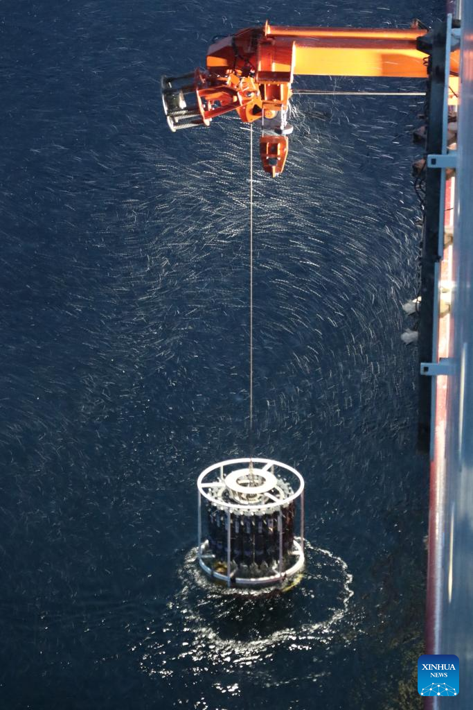 A Conductivity, Temperature, and Depth (CTD) sensor is retrieved to China's research icebreaker Xuelong 2, Sept. 8, 2025. China's research icebreaker Xuelong 2, or Snow Dragon 2, arrived in Shanghai on Friday, marking the completion of the country's hitherto largest Arctic Ocean scientific expedition.