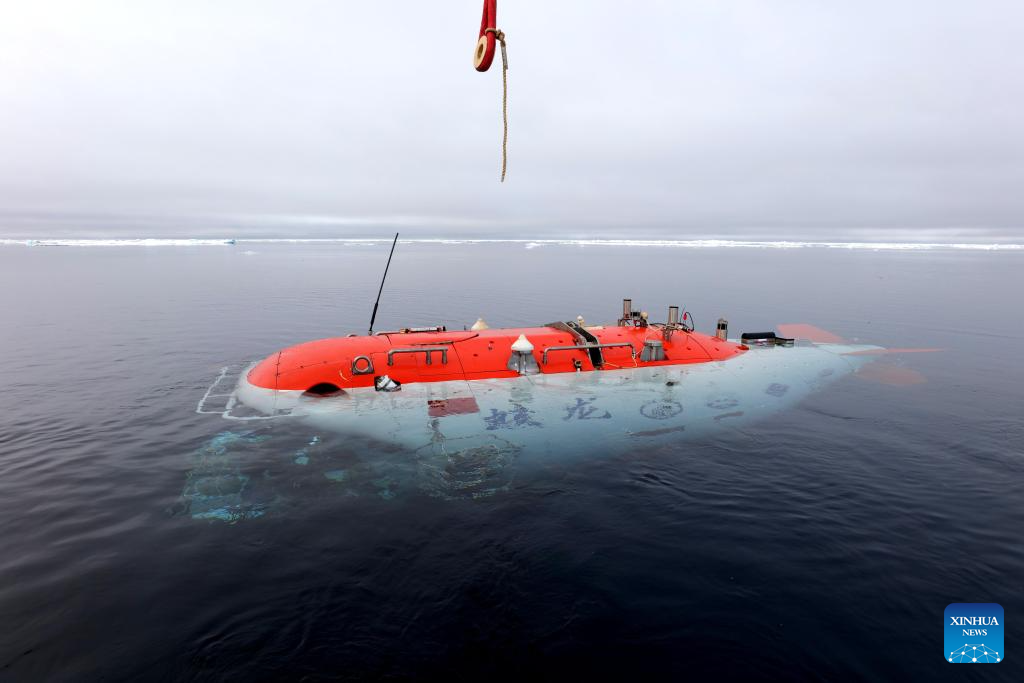 This photo taken on Aug. 6, 2025 shows China's manned deep-sea submersible Jiaolong diving in the Arctic Ocean.